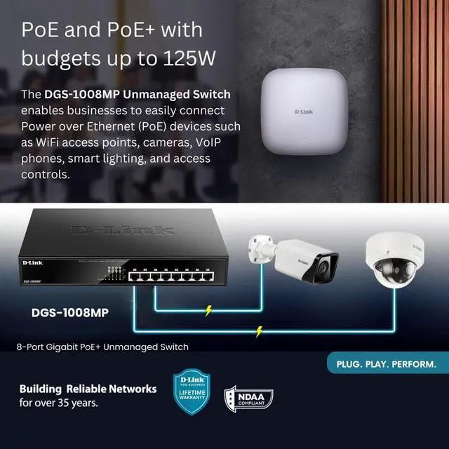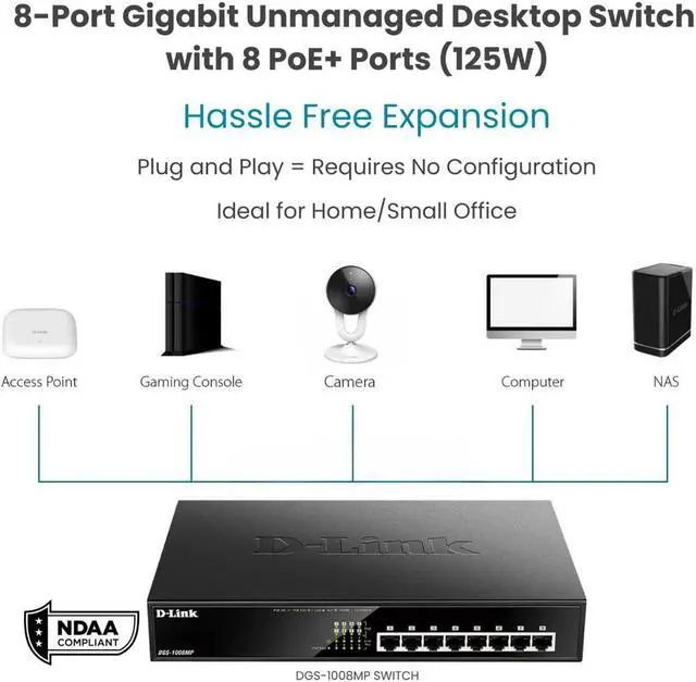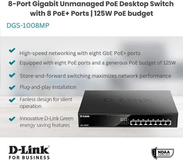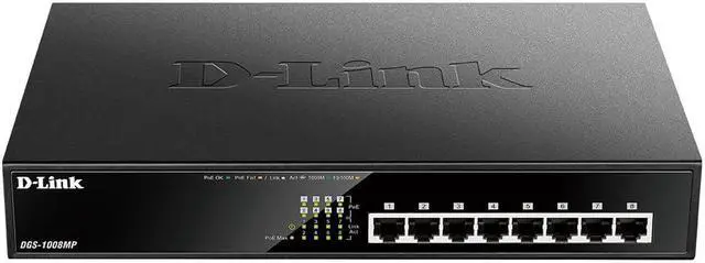 Built with small business and enterprise users in mind, the DGS-1008MP is a high-speed, flexible switch that features a fanless, quiet design so it can be conveniently placed anywhere in a working environment. It features eight 10/100/1000BASE-T ports that support the IEEE 802.3 at Power over Ethernet (PoE) standard. Each of the eight PoE ports can supply up to 30 W, with a total combined PoE budget of 125 W, allowing users to power up to eight IEEE 802.3 at-compliant devices without requiring an additional power supply.