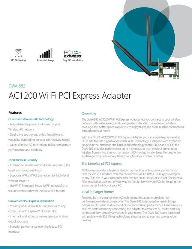 With the D-Link AC1200 Wi-Fi PCI Express Adapter (DWA-582) you can upgrade your Desktop PC to add the latest generation wireless AC technology. Designed with high-gain external antennas and dual Band technology (Both 2.4GH z and 5GHz) the DWA-582 provides performance Up to 4 times faster than previous-generation wireless N, meaning that you can stream HD movies, transfer large files, and enjoy lag-free gaming from more places throughout your home or office. The D-Link AC1200 Wi-Fi PCI Express Adapter is backward compatible to existing Wi-Fi networks and provides an optimal experience with an AC1200 Wi-Fi router.