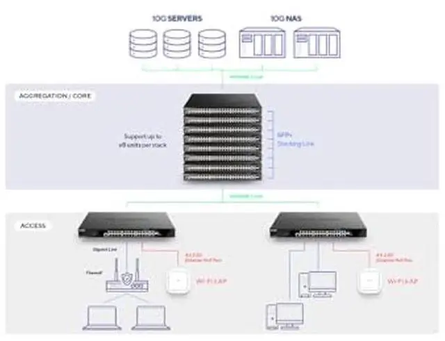 The DGS-1520 Series, a new generation of Layer 3 Stackable Smart Managed Switches, includes four 10 GB ports for uplink or stacking up to eight switches with a total of 80 Gbps stacking bandwidth. Designed for effortless multi-site network deployments with Zero Touch Provisioning, the DGS-1520 Series is also powerful enough for server and storage applications. For unrestricted Wi-Fi 6 edge device capabilities, PoE models offer four 2.5 GB BASE-T ports for Multi-Gigabit connectivity. For SMBs with expanding networks and significant bandwidth growth, the DGS-1520 effortlessly adds highly cost-effective 10 GB connectivity to help ensure seamless aggregation between access and core layers.