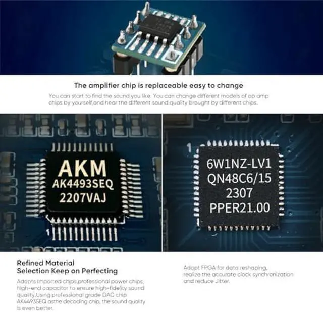 1. The amplifier chip is replaceable easy to change. You can start to find the sound you like. You can change different models of op amp chips by yourself, and hear the different sound quality brought by different chips.