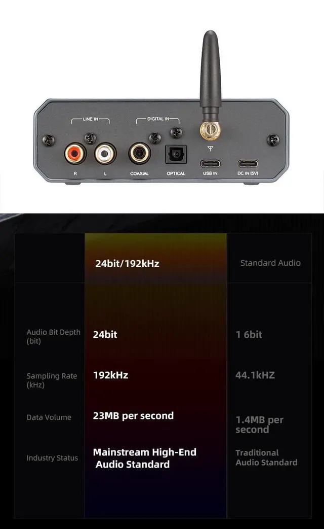 7. Button operation, simple and easy to get started. 8. Integrates Snapdragon Sound technology to provide high-fidelity audio transmission. 9. Supports traditional HD Bluetooth encoding formats such as aptX AD, aptX HD, and aptX. 10. Supports new-generation high-quality formats of LE Audio (LC3, aptX Lite) for efficient and ultra-low latency transmission. 11. The shell is made of high-strength aluminum alloy material. 12. Comes with an external high-gain antenna for longer transmission distance.