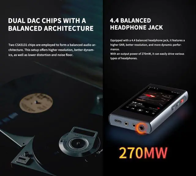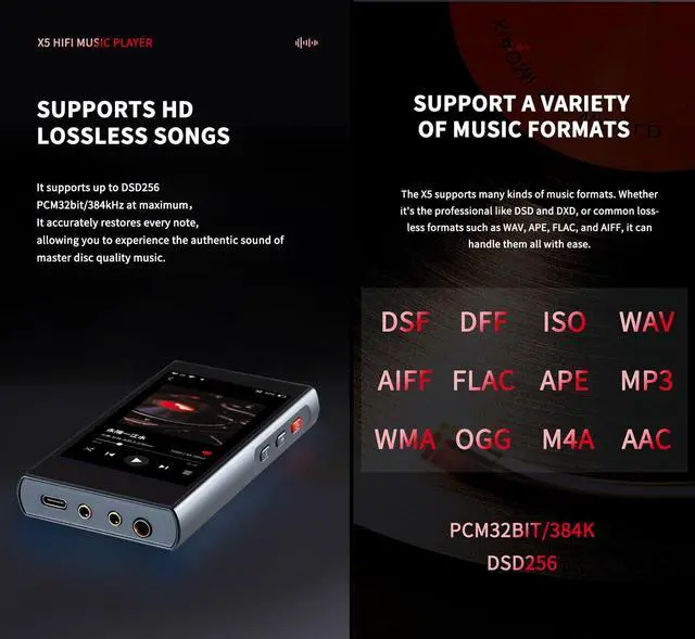 The X5 is a Hi-Fi lossless music player equipped with a touch screen. It features a 3.5 -inch IPS high-definition screen, providing clear image quality. Its DAC chips are employs two CS43131 chips to form a true balanced output circuit. The decoding supports lossless formats such as DSD, DXD, WAV, APE, FLAC, and AIFF, with a maximum sampling rate of 384kHz/32Bit and DSD256 ^^ X5 supports functions like EQ, voice search for songs, and Car-play mode. Its output power reaches 270mW, enabling it to effortlessly drive many types of headphones, making it the perfect spiritual companion for staying at home, working in the office, or traveling ^^