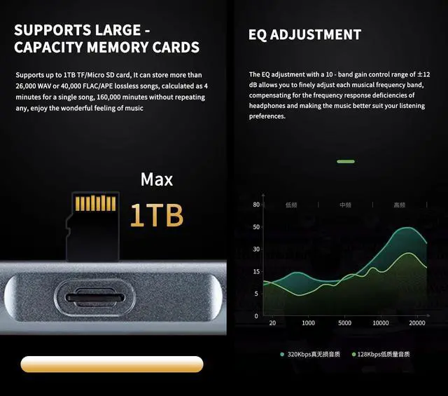 SUPPORTS LARGE CAPACITY MEMORY CARDS: Supports up to 1TB TF/Micro SD card, It can store more than 26000 WAVor 40000 FLAC/APE lossless songs, calculated as 4 minutes for a single song, 160000 minutes without repeating any, enjoy the wonderful feeling of music ^^
