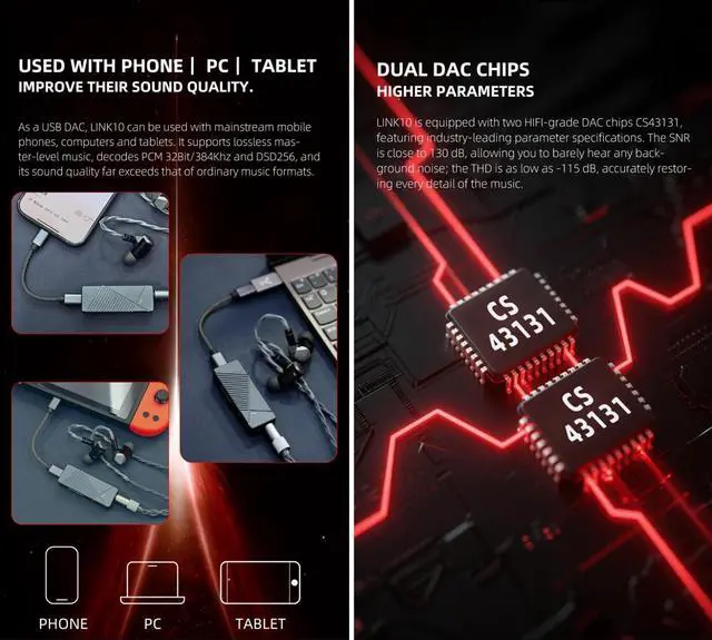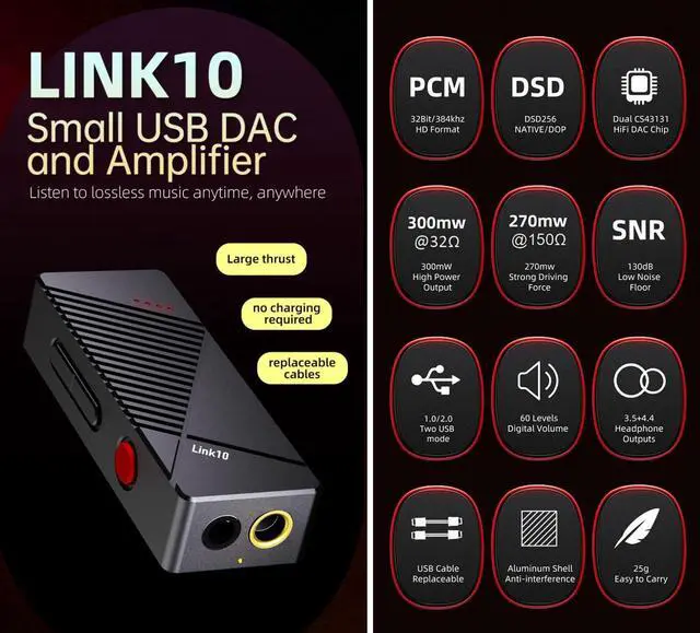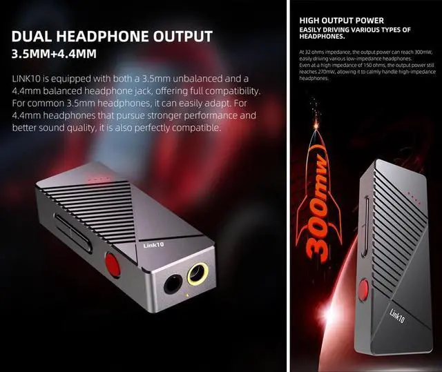 USED WITH PHONE I PC I TABLET, IMPROVE THEIR SOUND QUALITY As a USB DAC, LINK10 can be used with mainstream mobile phones, computers and tablets. It supports lossless master-level music, decodes PCM32Bit/384Khz and DSD256, and its sound quality far exceeds that of ordinary music formats. ^^ HIGH OUTPUT POWER, EASILY DRIVING VARIOUS TYPES OF HEADPHONES At 32 ohms impedance, the output power can reach 300mw, easily driving various low-impedance headphones. Even at a high impedance of 150ohms, the output power still reaches 270mw, allowing it to calmly handle high-impedance headphones.