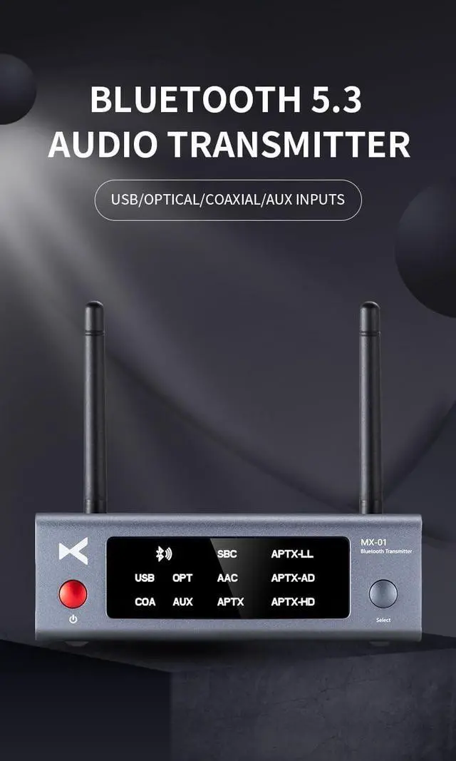 SUPPORTS MULTIPLE INPUT MODES: Equipped with USB, optical, coaxial, and AUX inputs, meeting the audio transmission needs of most devices, The optical and coaxial inputs support a maximum of 24 Bit/192kHz. ^^ DUAL-ANTENNA DESIGN FOR STRONGER AND MORE STABLE SIGNAL TRANSMISSION: External two-gain antennas provide a transmission range of up to 100 meters in unobstructed environments, meeting music needs in various scenarios. ^^ ALUMINUM ALLOY CASING FOR STRONGER ANTI-INTERFERENCE: Using high-strength aluminum alloy as the casing effectively shields against external interference, ensuring a more stable signal.