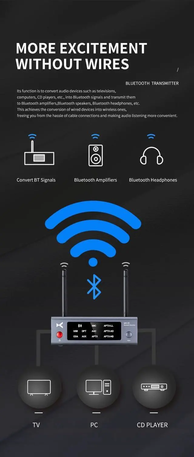 MORE EXCITEMENT WITHOUT WIRES: Its function is to convert audio devices such as televisions, computers, CD players, etc., into Bluetooth signals and transmit them to Bluetooth amplifiers, Bluetooth speakers, Bluetooth headphones, etc. This achieves the conversion of wired devices into wireless ones, freeing you from the hassle of cable connections and making audio listening more convenient. ^^ LOW LATENCY OR HIGH AUDIO QUALITY FORMATS: Elevate your HIFI setup with XDUOO MX-01's Qualcomm QCC3056 chip, Supports high-definition audio encoding formats such as aptX AD, aptX, aptX LL, aptX HD, AAC, etc. Automatically matches the format based on the supported format of the receiving device. ^^