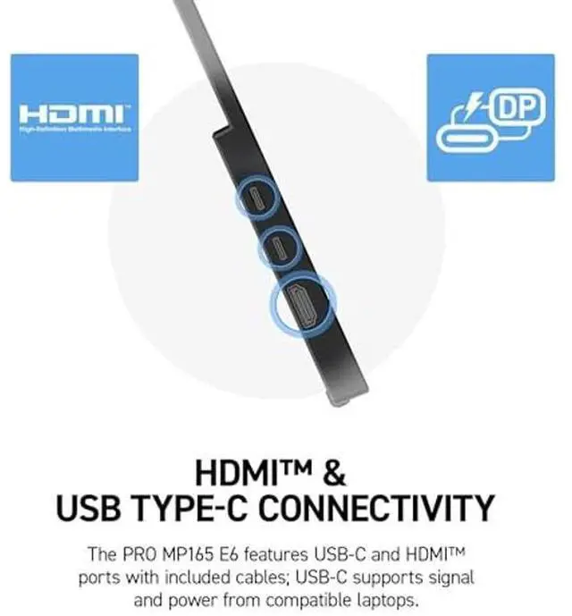 The MSI PRO MP165 E6 Portable Monitor features a crisp 15.6" Full HD (1920 x 1080) IPS panel with eye-friendly technology and an ergonomic foldable kickstand that supports both horizontal and vertical display orientations. With just one Type-C cable, this portable monitor receives both power and display signal, making it incredibly convenient and clutter-free. Simply plug and play for a seamless experience wherever you go.