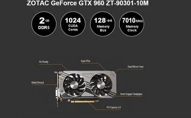 The ZOTAC GeForce GTX 960 is a high-performance graphics card designed with card delivers incredible performance, unmatched power efficiency, and cutting-edge features. The GPU represents a vast improvement over the performance of prior-generation technology which disables the dual 80mm fans when idle to lower noise and extend the life of the fans, the ZOTAC GeForce GTX 960 is the solution for enthusiasts.