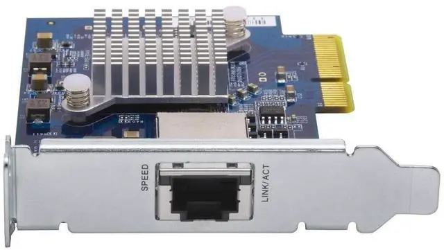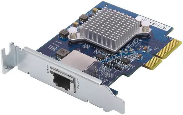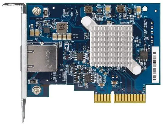 The QXG-10G1T is equipped with the aquantia AQtion AQC107 NIC that supports 10/5/ 2.5 /1Gbps and 100Mbps speeds. The RJ45 connector design also allows users to use their existing cables. By using Cat 5E cables, transmission speeds can reach up to 5Gbps, while using Cat 6a cables can deliver up to 10Gbps connectivity.
