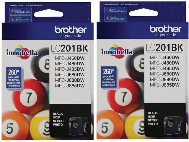 The genuine Brother LC201BK combo (2) pack features (2) LC201 OEM black inks. These inks work with the following Brothe models: MFC-J460DW, MFC-J480DW, MFC-J485DW, MFC-J680DW, MFC-J880DW, MFC-J885DW. Each ink has a yield of 260 pages.