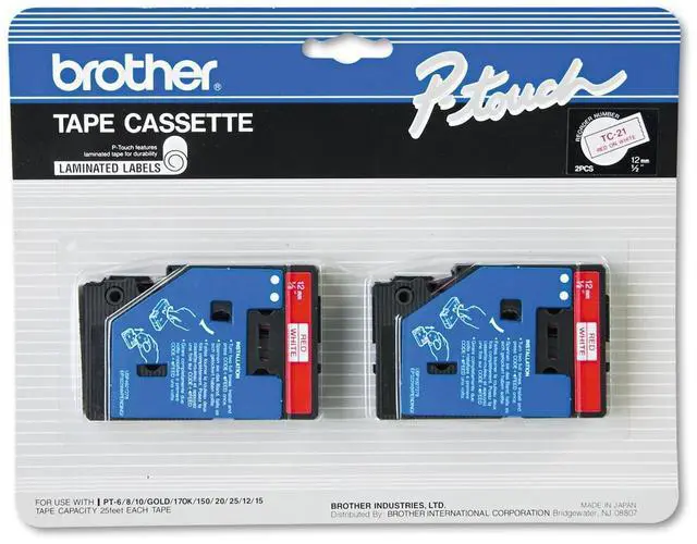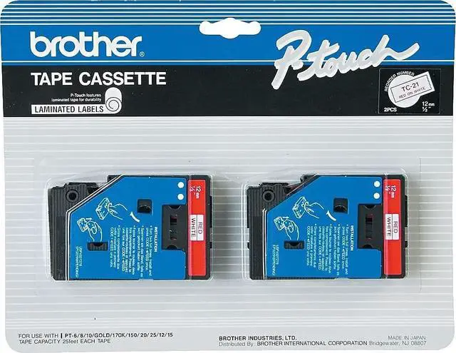 Brother TC-21 Red on White Tape Cartridges for P-Touch Labelers, .47" x 25.2' 2/Pack