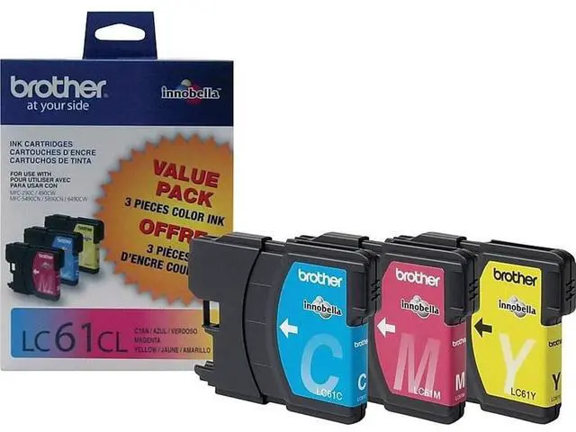 The Brother LC61 standard-yield cartridge is a high resolution cartridge. Buy genuine OEM LC61 ink cartridges. These print cartridge contains genuine Brother ink that provides quality and reliability every time you print. This set of 3 contains 1 Cyan LC61C, 1 Magenta LC61M, 1 Yellow LC61Y. All are Sealed in genuine plastic packaging.
