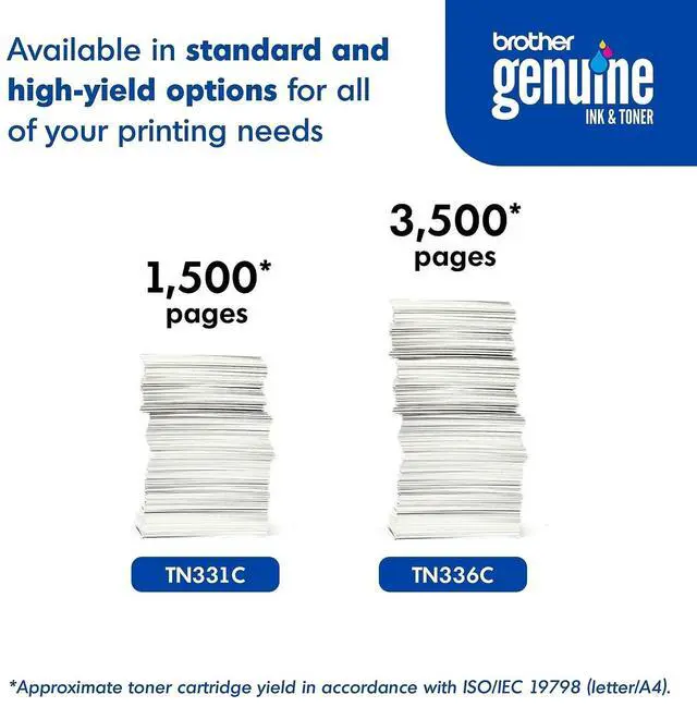The use of Brother Genuine replacement high-yield toner cartridges like the TN-336C not only produces sharp, color pages with the quality you expect from Brother products it also increases productivity and can reduce downtime when fulfilled through Dash Replenishment. The Brother TN-336C replacement laser cyan toner cartridge is for use with 5 Brother laser printers. This professional cartridge is intelligently engineered to work in seamless unison without compromising the quality of the print. Upon activation, Dash Replenishmenteligible Brother printers will seamlessly order Brother Genuine supplies through your account and ship them directly to your door.