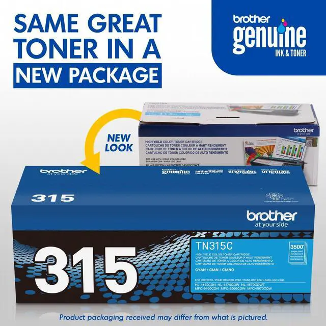 The use of Brother Genuine replacement high-yield toner cartridges like the TN-315C produces sharp, color laser pages with the quality you expect from Brother products. The Brother TN-315C replacement cyan toner cartridge is for use with 6 Brother laser printers. This professional cartridge is intelligently engineered to work in seamless unison without compromising the quality of the print. The Brother Genuine TN-315C replacement high-yield cyan toner cartridge can print approximately 3, 500 pages (1). Brother is dedicated to being environmentally responsible and offers disposal programs for properly discarding its cartridges. This replacement cartridge is for use with the following Brother printers and all-in-ones; HL4150CDN, HL4570CDW, HL4570CDWT, MFC9460CDN, MFC9560CDW, MFC9970CDW.