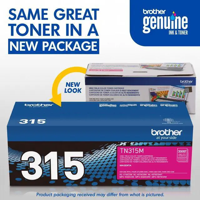 The Brother Genuine TN-315M replacement high-yield magenta toner cartridge can print approximately 3, 500 pages (1). Brother is dedicated to being environmentally responsible and offers disposal programs for properly discarding its cartridges. This replacement cartridge is for use with the following Brother laser printers and all-in-ones; HL4150CDN, HL4570CDW, HL4570CDWT, MFC9460CDN, MFC9560CDW, MFC9970CDW. (1) Approx. toner cartridge yields in accordance with ISO/IEC 19798 (Letter/A4) standards.