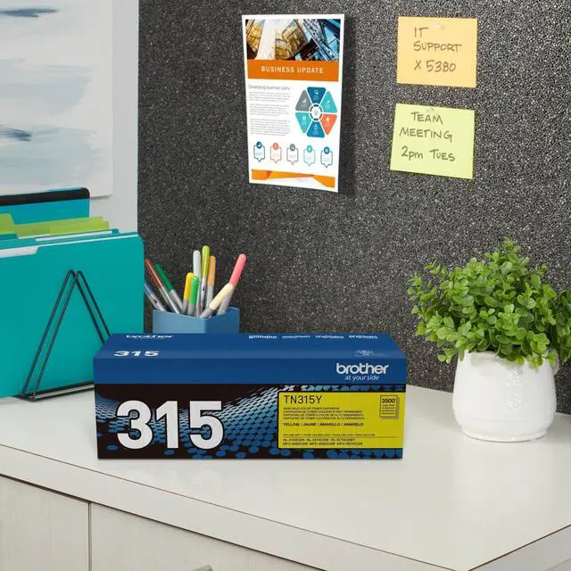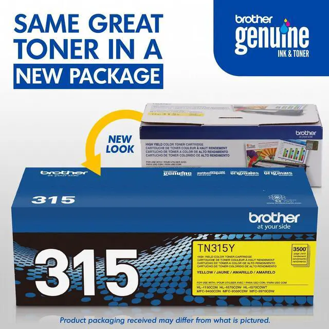 The use of Brother Genuine replacement high-yield toner cartridges like the TN-315Y produces sharp, color pages with the quality you expect from Brother products. The Brother TN-315Y replacement yellow toner cartridge is for use with 6 Brother laser printers. This professional cartridge is intelligently engineered to work in seamless unison without compromising the quality of the print. The Brother Genuine TN-315Y replacement high-yield yellow toner cartridge can print approximately 3, 500 pages (1). Brother is dedicated to being environmentally responsible and offers disposal programs for properly discarding its cartridges. This replacement cartridge is for use with the following Brother printers and all-in-ones; HL4150CDN, HL4570CDW, HL4570CDWT, MFC9460CDN, MFC9560CDW, MFC9970CDW.