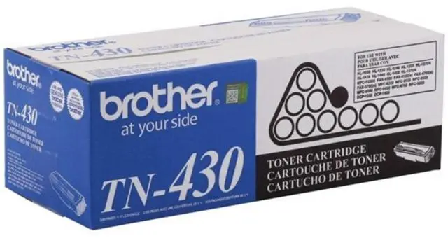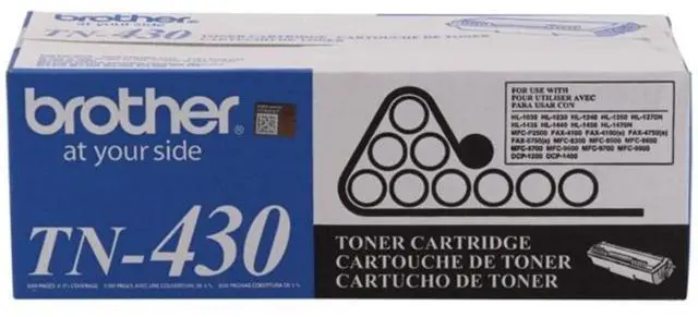 Product DescriptionThe use of Brother Genuine replacement standard-yield toner cartridges like the TN-430 produces sharp, black and white pages with the quality you expect from Brother products. The Brother TN-430 replacement laser black toner cartridge is for use with 24 Brother products. This professional cartridge is intelligently engineered to work in seamless unison without compromising the quality of the print. The Brother Genuine TN-430 replacement standard-yield black toner cartridge can print approximately 3, 000 pages (1). Brother is dedicated to being environmentally responsible and offers disposal programs for properly discarding its cartridges. This replacement cartridge is for use with the following Brother printers; DCP1200, DCP1400, IntelliFax4100e, HL1230, HL1240, HL1250, HL1270N, HL1435, HL1440, HL1450, HL1470N, MFC8300, MFC8500, MFC8600, MFC8700, MFC9600, MFC9700, MFC9800, MFCP2500, IntelliFax4100, IntelliFax4750, IntelliFax4750e, IntelliFax5750, IntelliFax5750e.