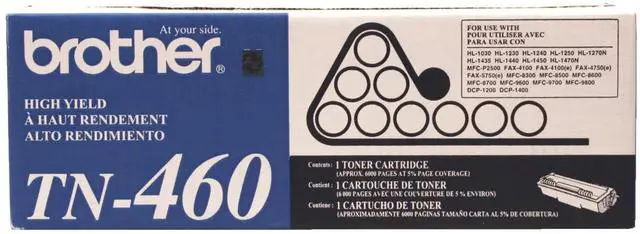 Product DescriptionThe use of Brother Genuine replacement high-yield toner cartridges like the TN-460 produces sharp, black and white pages with the quality you expect from Brother products. The Brother TN-460 replacement laser black toner cartridge is for use with 24 Brother products. This professional cartridge is intelligently engineered to work in seamless unison without compromising the quality of the print. The Brother Genuine TN-460 replacement high-yield black toner cartridge can print approximately 6, 000 pages (1). Brother is dedicated to being environmentally responsible and offers disposal programs for properly discarding its cartridges. This replacement cartridge is for use with the following Brother printers, all-in-ones and fax machines; DCP1200, DCP1400, IntelliFax4100e, HL1230, HL1240, HL1250, HL1270N, HL1435, HL1440, HL1450, HL1470N, MFC8300, MFC8500, MFC8600, MFC8700, MFC9600, MFC9700, MFC9800, MFCP2500, IntelliFax4100, IntelliFax4750, IntelliFax4750e, IntelliFax5750, IntelliFax5750e.