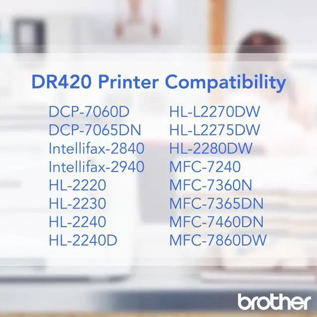 We offer several environmentally-responsible ways for our customers to dispose of their Brother branded products once they have served their purpose. Brother Genuine replacement supplies are backed by Brothers At Your Side Warranty and customers enjoy lifetime tech support for the life of their printers. The Brother DR420 Drum Unit is for use with DCP7060D, DCP7065DN, IntelliFax2840, IntelliFAX2940, HL2220, HL2230, HL2240, HL2240D, HL2270DW, HL2275DW, HL2280DW, MFC7240, MFC7360N, MFC7365DN, MFC7460DN, MFC7860DW (1) Drum yield is approx., and may vary by type of use.