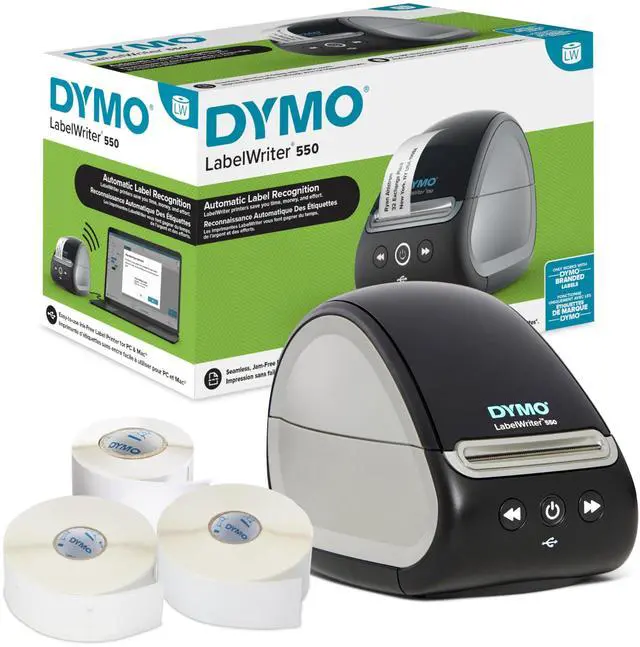 Label printing jobs come fast, accurate, and hassle-free with the DYMO LabelWriter 550 label printer. With its unique Automatic Label Recognition, you always know which labels (by size, type, and color) are loaded into the label maker at a glance. Youll also know how many labels are remaining, so you'll never run out mid-job. The direct thermal printer replaces the need to buy costly ink or toner, while the portable size helps it fit into any modern workspace with ease. It's up to 20% faster than the LabelWriter 450*.
