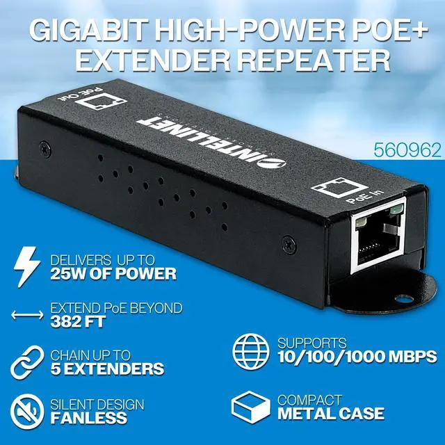 Extends an existing PoE connection beyond the 100m (328-ft. ) limit. Covers longer distances by cascading multiple PoE extenders together. ^^ Daisy-chain up to five PoE extenders for a distance of up to 600 m (1968 ft. ). Fanless design for silent operation. ^^ Supports 10/100/1000 Mbps data rates and delivers up to 25 W to a connected PoE device. Requires no additional power supply; draws the power directly from the PoE input. ^^ PoE awareness ensures that power is only sent to IEEE 802.3 af/at-compliant devices, non-PoE devices only receive data.
