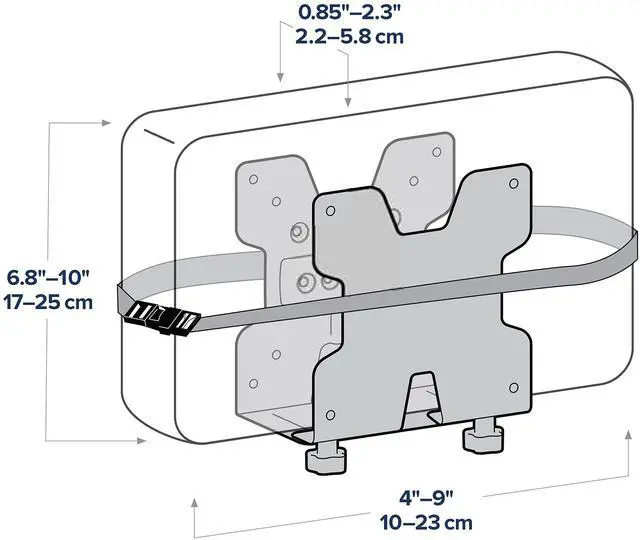 This versatile holder offers an easy method for integrating a small computer into your workspace. Its perfect for thin client hardware, a Wyse client, Mac mini or other peripherals. The universal design adapts to the dimensions of the box, while its mounting interface attaches to a variety of surfaces: a VESA plate, directly to a desk, clamped to a pole or fastened to Ergotron Wall Track. Size-adjustable holder fits a wide range of small computers Accommodates most all thin clients on the market Efficiently integrates a small computer into a display-mount configuration, creating a complete workstation solution Saves space with a universal VESA interface that attaches to any VESA mount with a 100 or 75 mm hole pattern