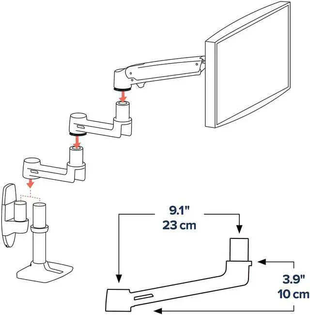 Add a second extension to your LX Desk Monitor Arm, Wall Monitor Arm or Keyboard Arm to increase its reach by 9 inches (23 cm). With another pivot-point, you get extra adjustment flexibility for a variety of uses.