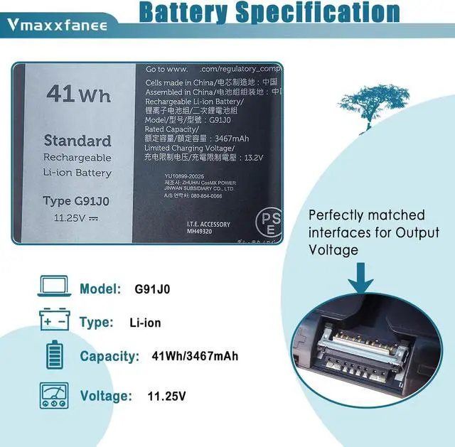 [(For Dell G91J0 battery Specifications)] Model: G91J0 . Voltage: 11.25V . Capacity:41Wh/3467mAh . Condition: 100% brand New from Manufacturer.