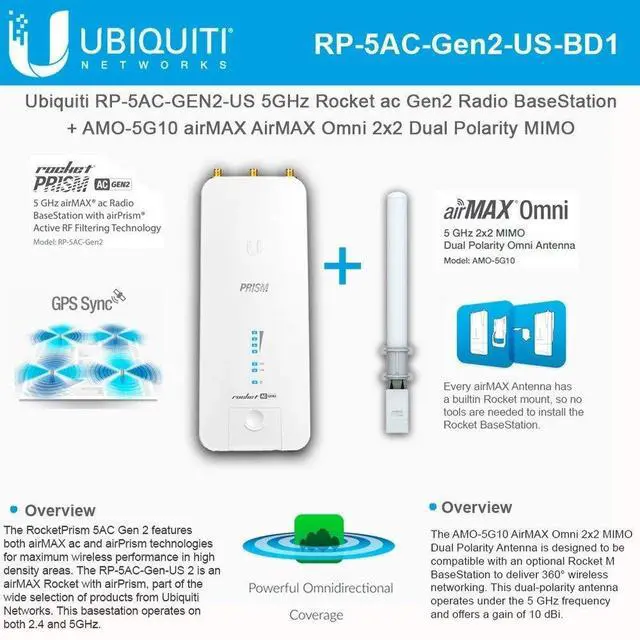 AirPrism BaseStation RP-5AC-GEN2-US 5GHz AC with AMO-5G10 10dBi Omni Antenna (US Version)