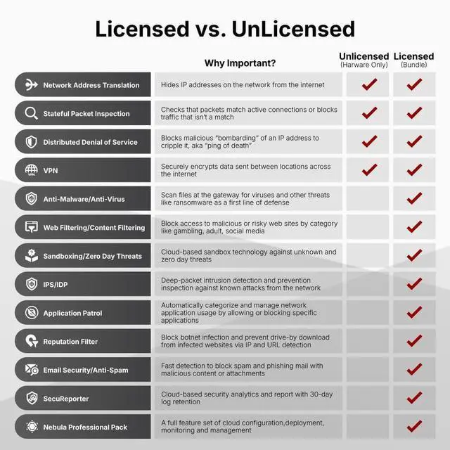 ^^ Complete security bundle: includes 1 year Gold Security sandboxing, DNS reputation, anti-malware, ransomware blocking, web filtering, application control and IDP security services and Nebula cloud Pro management.