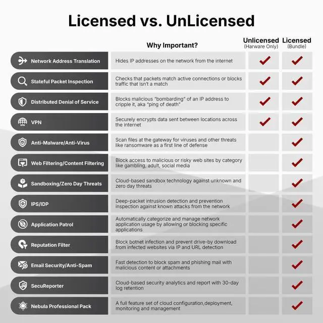 MULTI-LAYERED SECURITY HARDWARE: Reputation filtering (IP/DNS/URL) and SecuReporter visibility included in Entry Defense Pack, while the optional Gold Security Pack license unlocks anti-malware, sandboxing, web filtering, IPS, and full UTM ^^