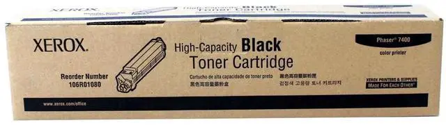 Xerox Phaser 7400 high-capacity toner cartridge part# 106R01080 (average standard yield 15, 000 pages) ensures extraordinary print quality, superior reliability and competitive cost-per-page. Xerox high-capacity toner cartridges for the Phaser 7400 printer give you more for the money, printing up to 15, 000 pages (at 5% average page coverage). This toner is also specially formulated for increased print consistency and continuity even on rough papers. For performance, reliability, and quality you can count on page after page, trust genuine XEROX supplies every time. Genuine XEROX printers and supplies - they're made for each other.
