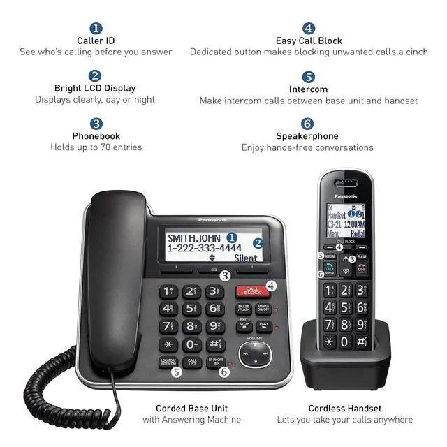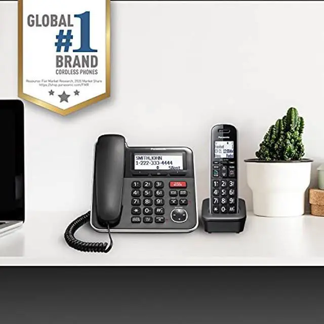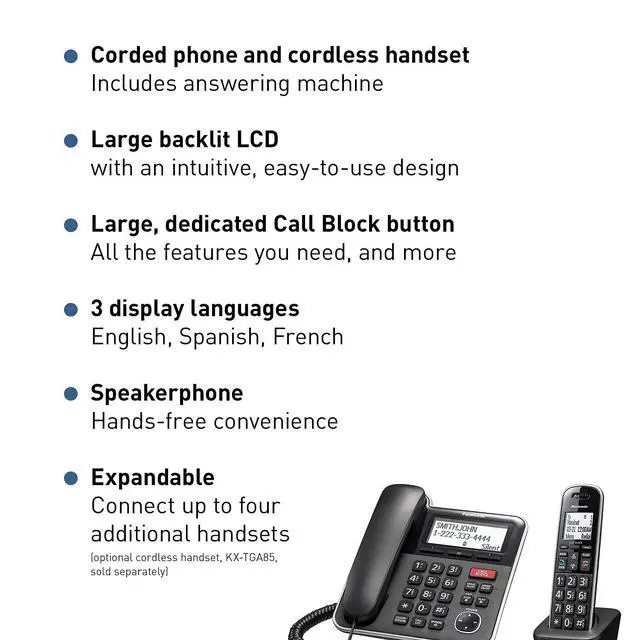 The Panasonic Expandable KX-TGB850B Corded Telephone with Cordless Handset and Answering System is an essential phone for any home. With both corded and cordless handsets, it is incredibly versatile, letting you comfortably make and receive calls anywhere in your home. Its large backlit LCD display and intuitive keypad ensure that you can see and complete every call with confidence. Despite its small size, the phone is incredibly powerful, with Caller ID, Block, Phonebook, Redial, and Speed dial -- the functions you need at your fingertips. Line Power Mode keeps this phone functioning even during temporary blackouts.