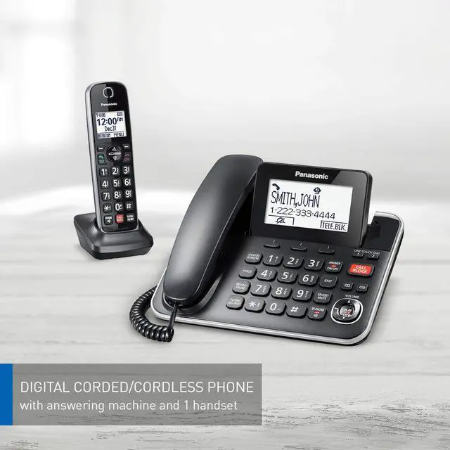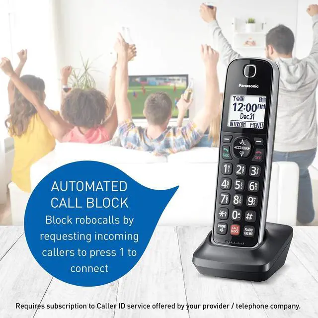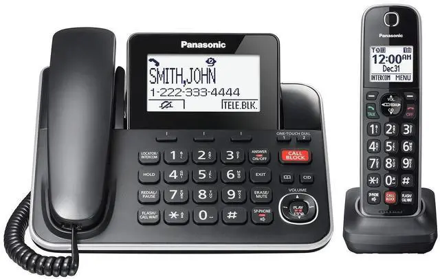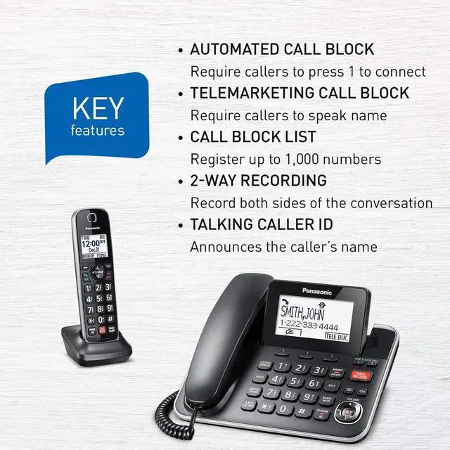 Panasonic's DECT 6.0 KXTGF870 corded/cordless phone is ideal for busy households, with extra control over who you choose to speak with. Advanced Call Block requires unknown callers to press 1 to connect in order to screen out machine calls. Telemarketing Call Block requires unknown callers to announce their name, so you can decide whether to answer or block the call. The Call Block Button on base can be used for up to 1000 numbers, with the number of blocked calls displayable on the LCD screen. Plus, Talking Caller ID works with your service provider to announce registered numbers.
