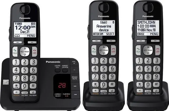The Panasonic KX TGE433B expandable Digital Enhanced Cordless Telecommunications (DECT) 6.0 Phone system with answering machine and 3 cordless handsets is a smart, reliable home/home office solution designed to make every day call management easier and more convenient for everyone, no landline required. Includes one cordless handset in the base unit and two additional cordless handsets, expandable up to six handsets (additional handsets sold separately). Large, white backlit LCD and dedicated volume control on the included three cordless handsets and base unit are ideal for enhanced visibility and hearing comprehension. One touch Noise Reduction suppresses background interference from callers in noisy locations.