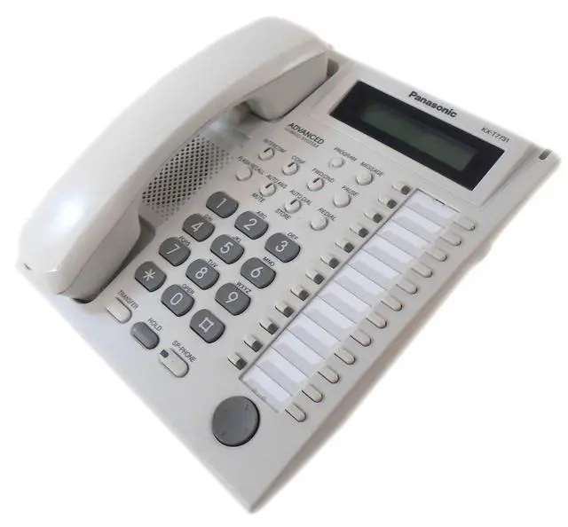 - 24-Button Speakerphone Telephone- 24 Programmable CO keys- Speakerphone- 1 Line backlit alphanumeric LCD display - Automatic redial- Hands-free answer back- Redial hold/flash mute store message inter/conference forward/do not disturb program pause/transfer and volume control keys- Off low and high ringer volume switches- 2.5 mm headset jack- Wall mountable- Available in black or whiteKXT7731