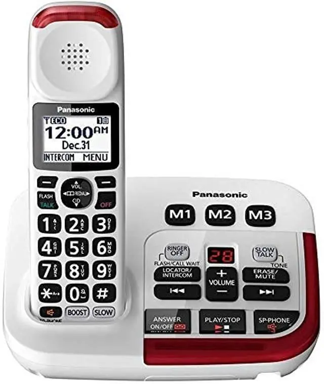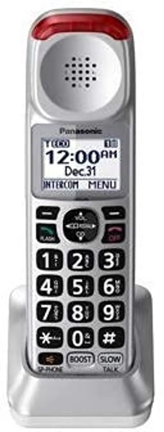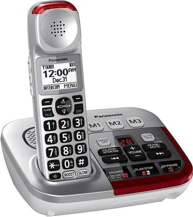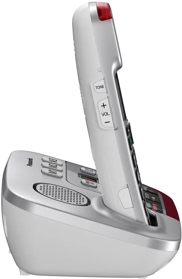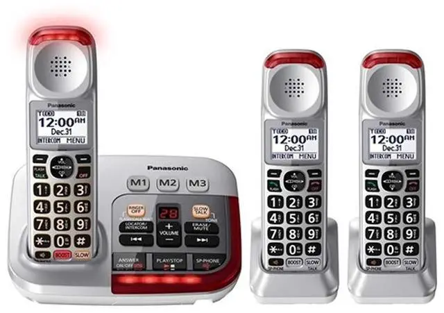 FEATURES: - Brushed Silver Finish Base Unit and Handset- Expandable to 6 Handsets- 6-Level and Custom Voice Tone Settings- Voice Volume Booster to 50 dB- Speech Booster- Slow Talk Control- Ringer Volume up to 112 dB- 15 Ring Tone Settings- Ringer Off Key- Noise Reduction- Battery Power Backup3- 13 Hours Talk Time- 9 Days Standby Time- Talking Caller ID (English and Spanish) 4, 7- Talking Keypad and Phonebook7- White Backlit LCD on Handset- Speakerphone- Call Waiting and Intercom4- 250 Call Block Database9- 17 Minutes Voice Messaging- Bright Red LED Visual RingerPackage Includes: 1 Base / Cordless Handset2 Cordless Handsets / Chargers