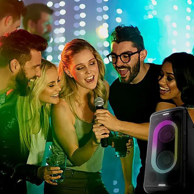Add in multicolor lighting and Bass Boost, and you've got a party-perfect speaker thats as fun as it is powerful. Stream your favorite songs via Bluetooth, plug in your guitar or mic for live jams, or turn it into a karaoke machine with friends. You can even connect multiple speakers for an epic sound experience. With USB playback, AUX input, and Chain Connection, this speaker is ready for whatever youve got planned. Dance the night away with up to 15 hours of playtime on a single charge. A built-in display shows battery life, while the sturdy handle and tough design make it easy to grab and go.