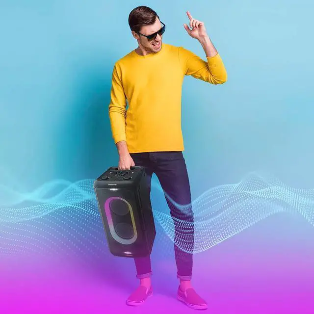 No matter where you are, the music keeps going strong. For extra flair, sync the lights to your music with 7 colors, 12 patterns, and two strobe lights to choose from. The intuitive controls, big buttons, and an LED screen make it super easy to useno fiddly switches here! Just plug in, turn up, and let the party begin.