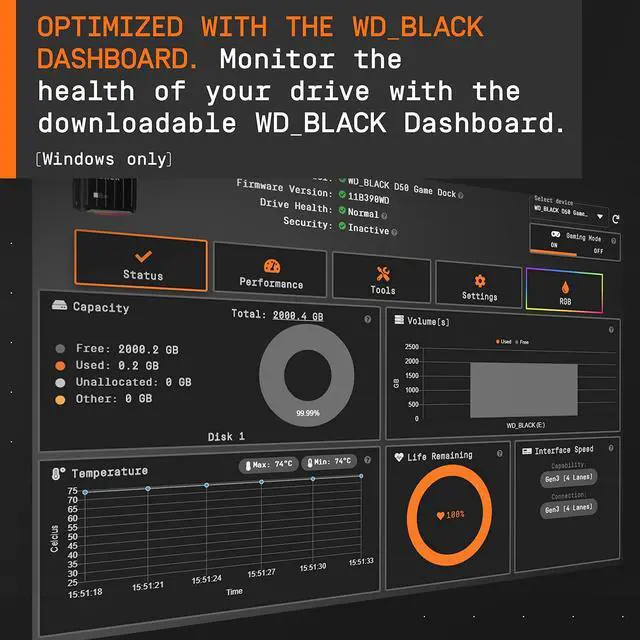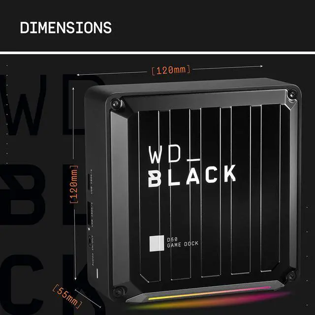 Easily transform your laptop into a fully integrated gaming station with the WD_BLACK D50 Game Dock NVMe SSD, clearing the clutter through a single Thunderbolt 3 cord that seamlessly connects to multiple peripherals and an additional screen in up to 5K 60Hz to create the ultimate streamlined gaming station. Get in the game faster with NVMe technology reaching up to 3000MB/s read speed and up to 2500MB/s write speed. The compact and sleek design is complete with fully customizable RGB lighting to personalize your station (Windows only).