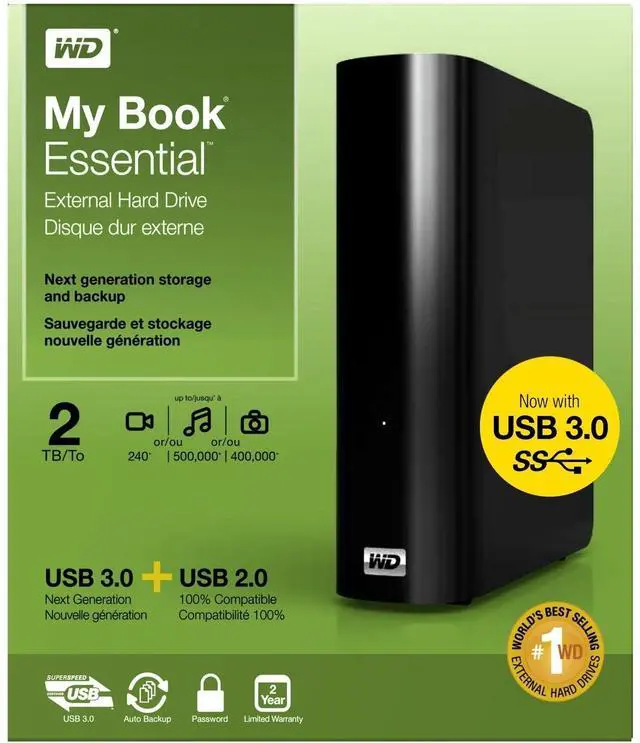 Put your digital life on the sleek, high capacity My Book Essential external hard drive. With WD quality and USB 3.0 and USB 2.0 connectivity, this drive is designed for today with tomorrow in mind. WD quality inside and out - My Book External drives are the world's best selling drives. There's a reason. We've been making hard drives for 20 years and we know how to protect your data. USB 3.0 plus USB 2.0 - A single drive with universal compatibility today and next-generation speed for tomorrow. Use it with USB 2.0 now and step up to USB 3.0 speed when youre ready.
