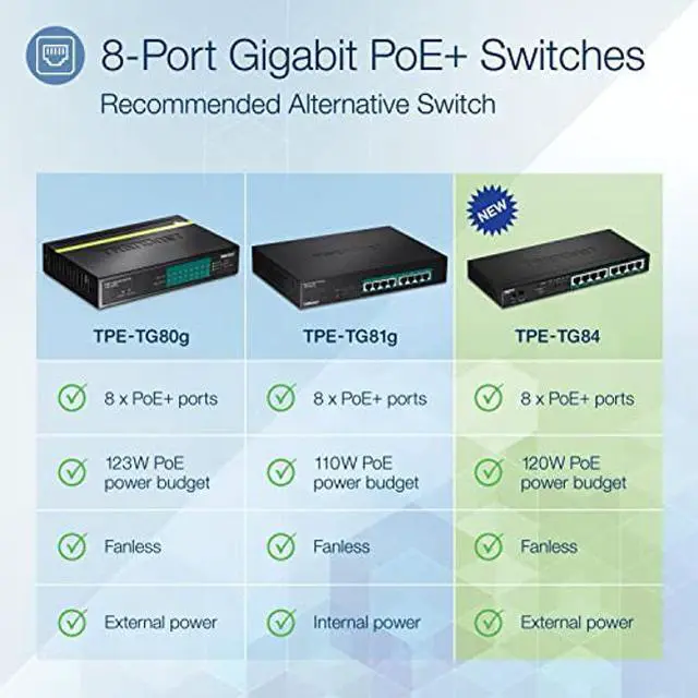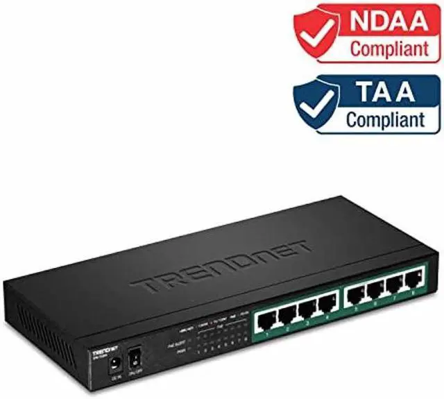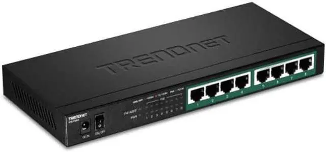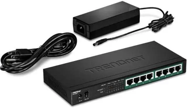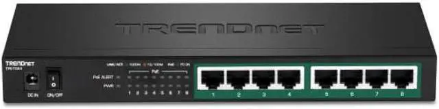TRENDnet's 8-Port Gigabit PoE+ Switch, model TPE-TG84, reduces equipment and installation costs by delivering data and power over existing Ethernet cables. With PoE technology, users only need one set of cables to deliver both data and power. This compact network switch provides eight gigabit PoE+ ports with a total PoE power budget of 120W. The TPE-TG84 PoE+ switch allows you to network PoE devices, such as wireless access points, IP cameras, VoIP phones, IP video encoders, access controls, and more. It features a fanless design, and has a convenient option for wall mounting.