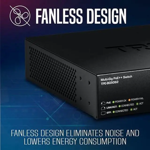 A 240W total PoE power budget on this multi-gig PoE++ switch supplies up to 95W per PoE port. Easily network PoE devices, such as high-power wireless access points, IP cameras, digital signage, IPTV decoders, access controls, and more with this high-power 2.5 gigabit PoE++ switch. This PoE++ switch uses GaN power technology. GaN technology allows power supply designs to be smaller and more efficient. Compared with traditional power supplies, GaN power supplies take up to 40% less foot print. The increased efficiency reduces heat generated by the internal power supply - reducing the need for fans for silent operations.