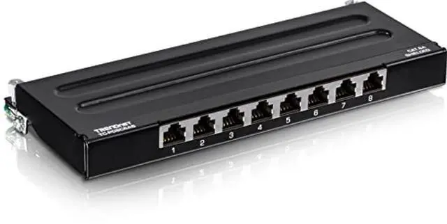TRENDnet's 8-Port Cat6A Shielded Wall Mount Patch Panel, model TC-P08C6AS, is ideal for gigabit and 10G Copper Ethernet network applications. This patch panel is ideal for use with Cat6A shielded cabling, which is specifically designed to eliminate EMI and crosstalk, ensuring peak performance and data integrity