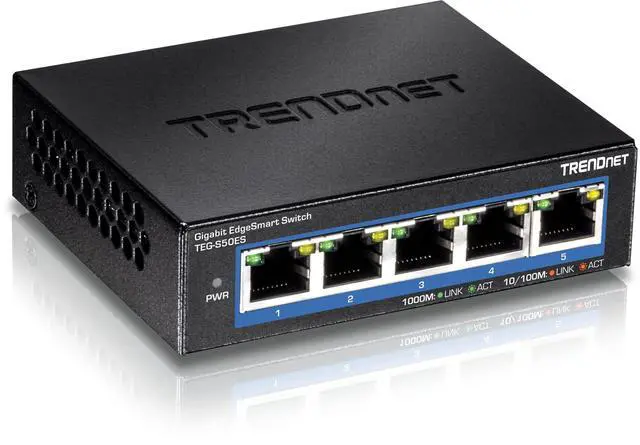 TRENDnets 5-Port Gigabit EdgeSmart Switch, model TEG-S50ES, is a cost-effective switch solution for high-speed gigabit applications. This 5-port smart switch features the most commonly used managed switch features, reducing unnecessary switch complexity. The web-based management interface offers features for traffic control, RSTP, VLAN, QoS, access control, static link aggregation, and monitoring. TRENDnets TEG-S50ES allows for simple network integration into your SMB network. EdgeSmart ManagementProvides an easy-to-use web-based management interface for reduced switch configuration complexity and offers a combination of more commonly used SMB management features for simpler deployment.