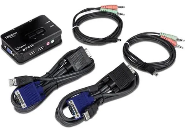TRENDnet's 2-Port USB KVM Switch Kit with Audio, model TK-209K, allows you to control multimedia PCs with just one keyboard, monitor, mouse, microphone, and a set of speakers. The KVM switch not only allows you to share your monitor, keyboard and mouse, but you can also share microphone and speakers. With just a simple press of a button, this KVM switch eliminates the hassle of cable swapping and switching between 2 PCs. With its Hot-Plug, Auto-Scan, and Hot-Key operating features, the TK-209K KVM Switch is an ideal choice for managing 2 PCs.