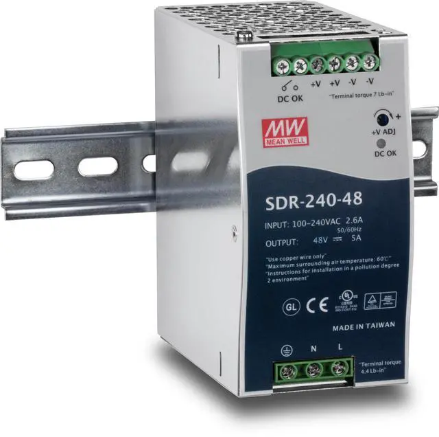 TRENDnets high efficiency 240 W Single Output Industrial DIN-Rail Power Supply, model TI-S24048 (Mean Well SDR-240-48), supplies up to 240 Watts (48 V, 5 A) of power to industrial PoE equipment such as switches, network cameras, and WiFi access points. This power supply comes with active PFC, an integrated DIN-rail mount, and overload current protection.