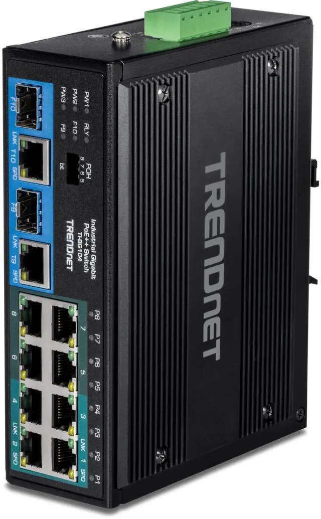 TRENDnet's Industrial Gigabit PoE++ DIN-Rail Switches delivers network connectivity to rugged environments, while saving you on installation costs and setup time using Power over Ethernet technology. The industrial PoE++ switches each feature a rugged IP30 rated metal enclosure, designed to withstand a high degree of vibration and shock, while operating in both high and low temperatures for industrial environments within -40° 75° C (-40° 167° F). These hardened industrial PoE++ switch models feature copper Gigabit PoE+ ports for high-speed device connections, and SFP slots that support 1000Base-FX modules for long distance fiber networking applications.