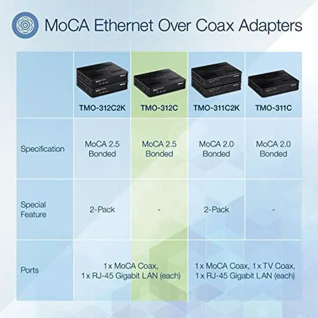 TRENDnets MoCA 2.5 Ethernet Over Coax Adapter, model TMO-312C, uses your existing coaxial cables to extend a high-speed building-wide Triple Play network throughout your home or office. These compact MoCA adapters are designed to support MoCA 2.5 deployment for digital TV, high speed-internet, and VoIP single-access subscription service offerings. Compliant with Multimedia over Coax Alliance (MoCA 2.5 ) standards with improved packet error rate technology that delivers consistent voice and video bandwidth with lowered latency.