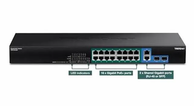 DEVICE INTERFACE: 16 x Gigabit PoE+ ports (up to 30W); 2 x Shared Gigabit SFP Slots; LED indicators; Internal Power Supply